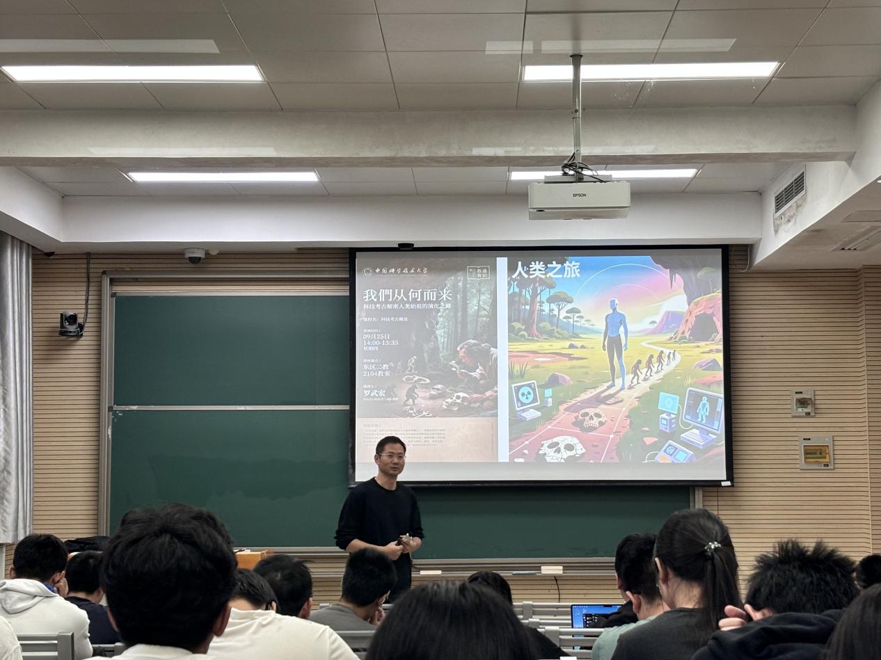 9月25日,通识教育系列讲座第59期《我们从何而来:科技考古解密人类始祖的演化之路》在科大东区第二教学楼2104教室顺利举办。本次讲座由科技史与科技考古系副教授罗宏武老师主讲,深入浅出地串联起考古学、分子生物学等多学科知识,带领听众探索人类从远古祖先到现代智人的演化历程,解答“何以成为今天的人”这一根本问题。