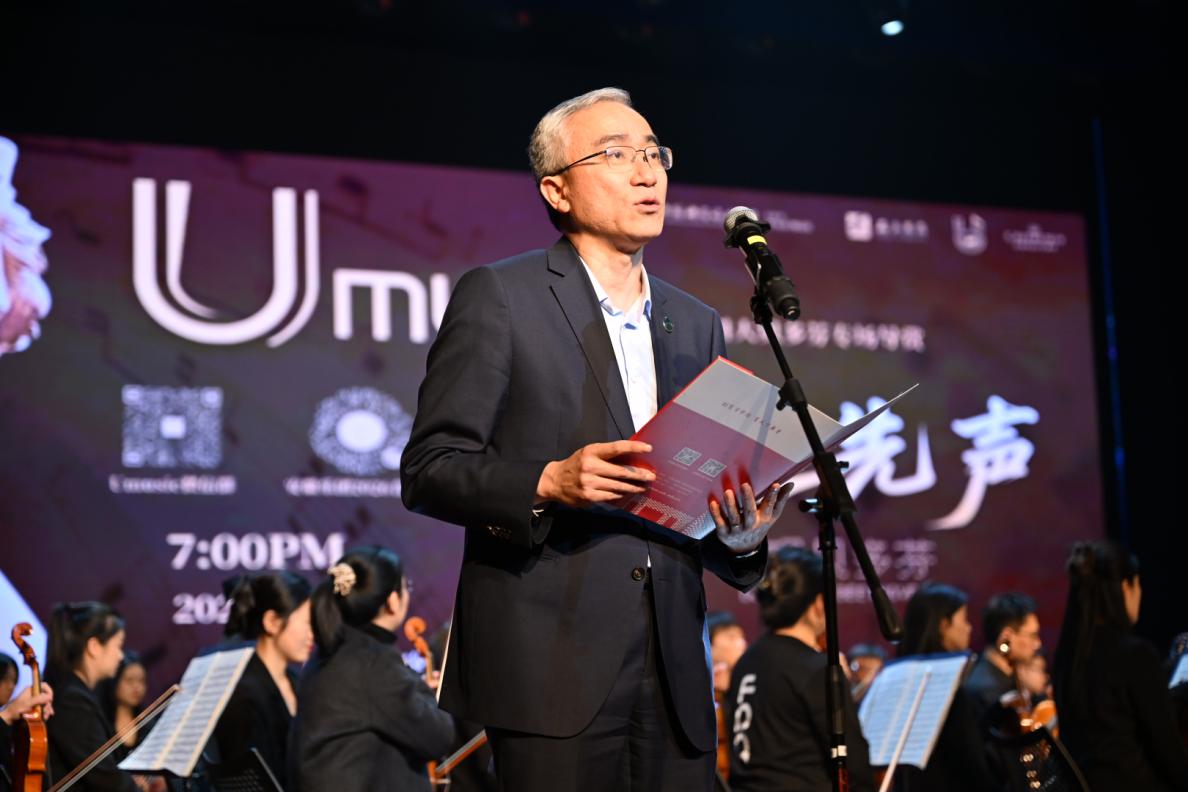 在致辞中,薛天对安徽乐团艺术家们的到来表示热烈欢迎,并强调科学之“美”与艺术之“美”是相通的,学校始终高度重视美育工作,注重培养学生人文艺术修养。